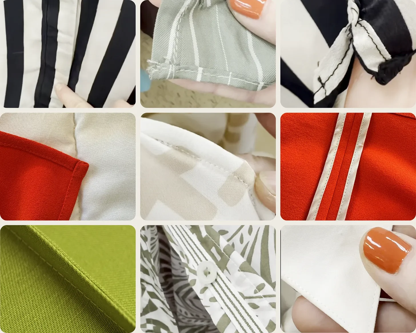 First row from left — 1: placket not laying flat, 2 & 3: low quality hem and finishing. Second row from left — 4: nicely finished hem on a Rachel Comey blouse, 5: French seam on a Joie blouse, 6: bias binding seam on same Rachel Comey blouse. Third row from left — 7: better view of a French seam (image credit), 8: extra finishing detail in the grosgrain ribbon on a Talbots shirt, 9: small straight quality stitches on a Brooks Brothers shirt.